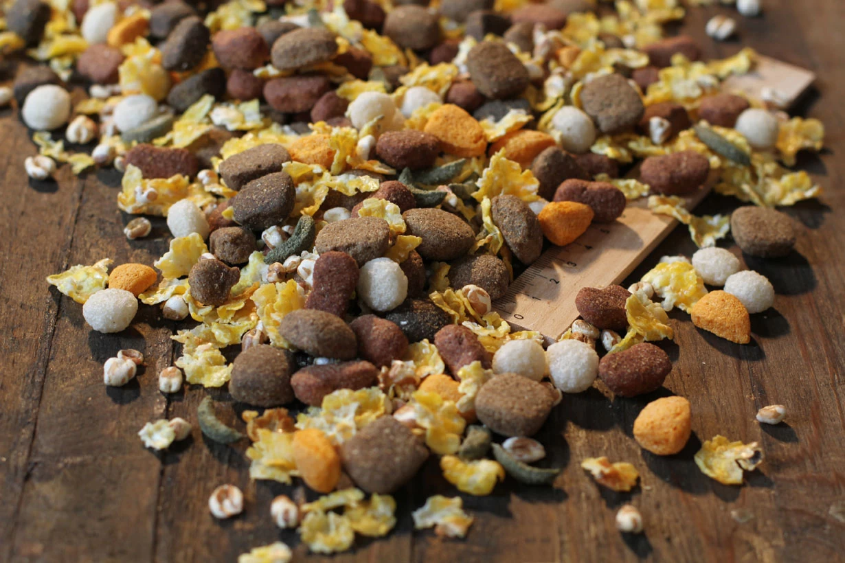 Maisflocken; Grieben, getrocknet (13 %); Weizen; Proteine aus der Gelatinegewinnung; Maisfuttermehl; Weizen, expandiert; Reis, extrudiert (4,5 %); Pflanzenöl (Palm; Kokos); Geflügelprotein; Bierhefe, getrocknet (2,5 %); Gemüse, extrudiert; Geflügelfett; Rübentrockenschnitzel, entzuckert; Geflügelleber, hydrolysiert; Fischmehl aus Meeresfischen; Gerste; Dicalciumphosphat; Natriumchlorid; Ei, getrocknet; Johannisbrotschrot, getrocknet; Calciumcarbonat; Kaliumchlorid
