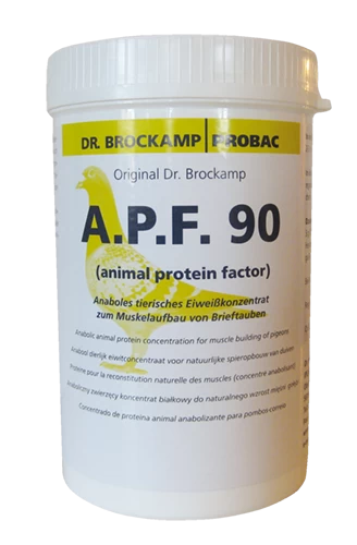 Die Taube gewinnt ihre Flugenergie zu ca. 90 % aus dem Fettstoffwechsel, also der Verbrennung von Fettsäuren. Zu etwa 10 % jedoch wird die Flugenergie aus der Verbrennung von Protein als Energiequelle gewonnen. Diese stammt aus dem Abbau von Muskelmasse, wodurch die Taube während der Reisezeit von Woche zu Woche an Substanz verliert. Um diese möglichst schnell regenerieren zu können, benötigen die Muskeln Proteine. In der Trainingsphase (Reisezeit) findet das Muskelwachstum primär während der Erholungsphase statt, also über Nacht. Daher ist es wichtig, dass der Körper in dieser Phase ausreichend mit Protein versorgt ist. A.P.F. 90 ist ein natürlicher Muskelbildner, hat also anabole Wirkung. Es wurde so entwickelt, dass es langsam vom Körper absorbiert wird und ihn so über einen langen Zeitraum mit den Eiweißbausteinen, den Aminosäuren, versorgt. Empfohlen wird die Verabreichung nach dem abendlichen Training. Dadurch wird sicher gestellt, dass der Organismus mit allen essentiellen Aminosäuren für den Muskelaufbau versorgt wird.