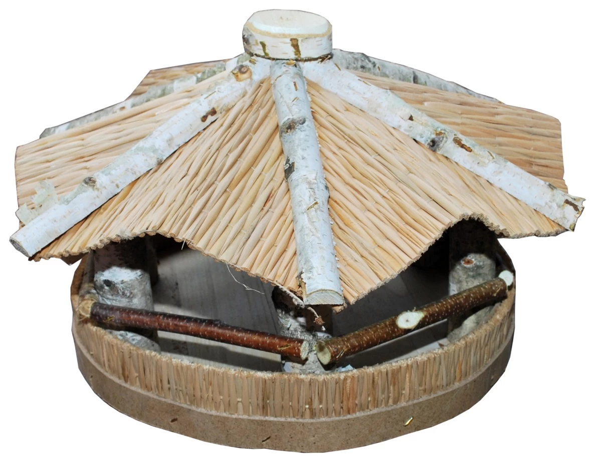 Dieses runde Futterhaus in den Maßen 40 x 40 x 25 cm ist von allen Seiten zugänglich und besticht mit einem gewölbten sechseckigen Strohdach. Die Montage erfolgt mittels Flügel-Schraube (nicht im Lieferumfang enthalten) durch die Bodenplatte. So lässt sich dieses Futterhaus problemlos auf einem Ständer oder Baumstumpf befestigen.