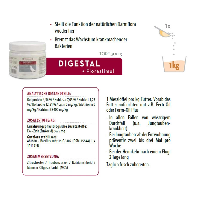 Darmconditioner mit Probiotika zur Unterstützung der natürlichen Darmflora. Hilft vor allem bei jungen Tauben, bei Darmproblemen