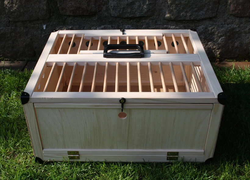 Robuster und leichter Taubenkorb mit einer Klappen an der Oberseite und einer großen Frontklappe. Der Taubenkorb ist für den Transport von ca. 6 Tauben geeignet.